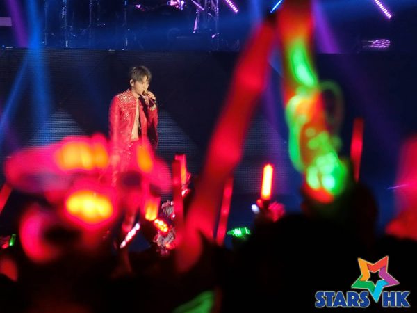 金在中不時用廣東話「鐘意嗎?」「多謝晒」來回應大家。逗笑說雖然自己懂的廣東話不多,但大家都好像全都聽得懂,感覺非常精奇!而且「多謝晒」3個字估計今晚最少會講50次。金在中還細心照顧到現場的男粉絲,表示特別感謝及非常欣賞男性粉絲的長情,會長久支持同一位偶像。