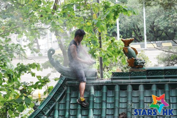 一向畏高的葉文龍,今次克服十米高度為細威運送瓦片及水泥等,又拿起掃把清理牌坊頂樹葉。不過他說最緊張的任務是在地下想辦法,萬一細威滑落牌坊如何拯救他!