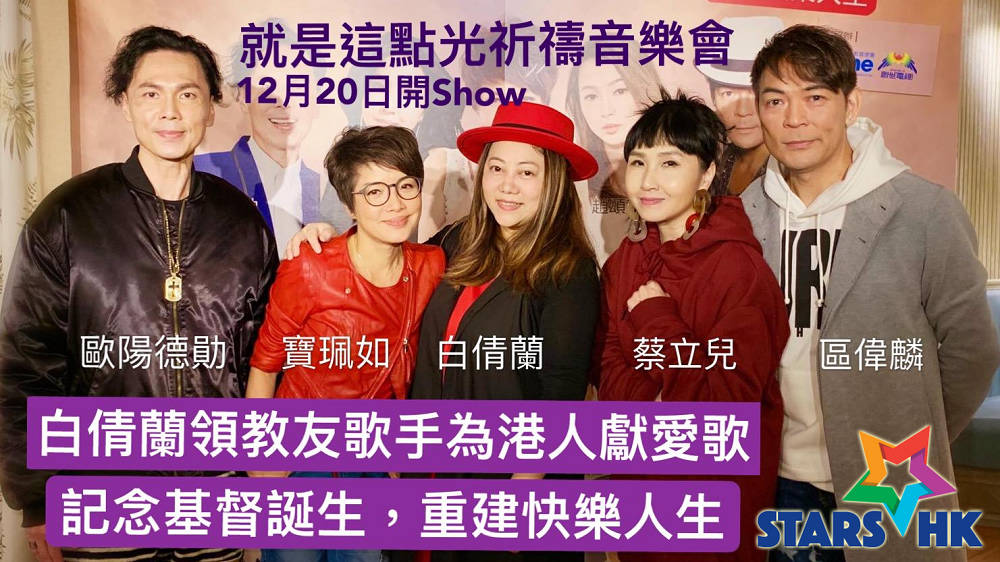 2019年12月20日近聖誔及年尾,福音歌手白倩蘭連同基督徒歌手寶珮如、區偉麟、蔡立兒、歐陽德勛、趙頌茹、RF2樂隊等人作最後衝刺,以大愛及正能量金曲、詩歌為港人送暖,希望透過自己的專長、恩賜、以音樂和禱告為您心靈解放,安慰支援!《就是這點光-聖誕祈禱音樂會》由「摘星演藝製作」主辦,影音使團、創世電視,音樂過來人協辦,昨日舉行記者招待會,藝人漢洋、李龍基、劉錫賢、寇鴻萍、鄒敏夷出席支持正能量。