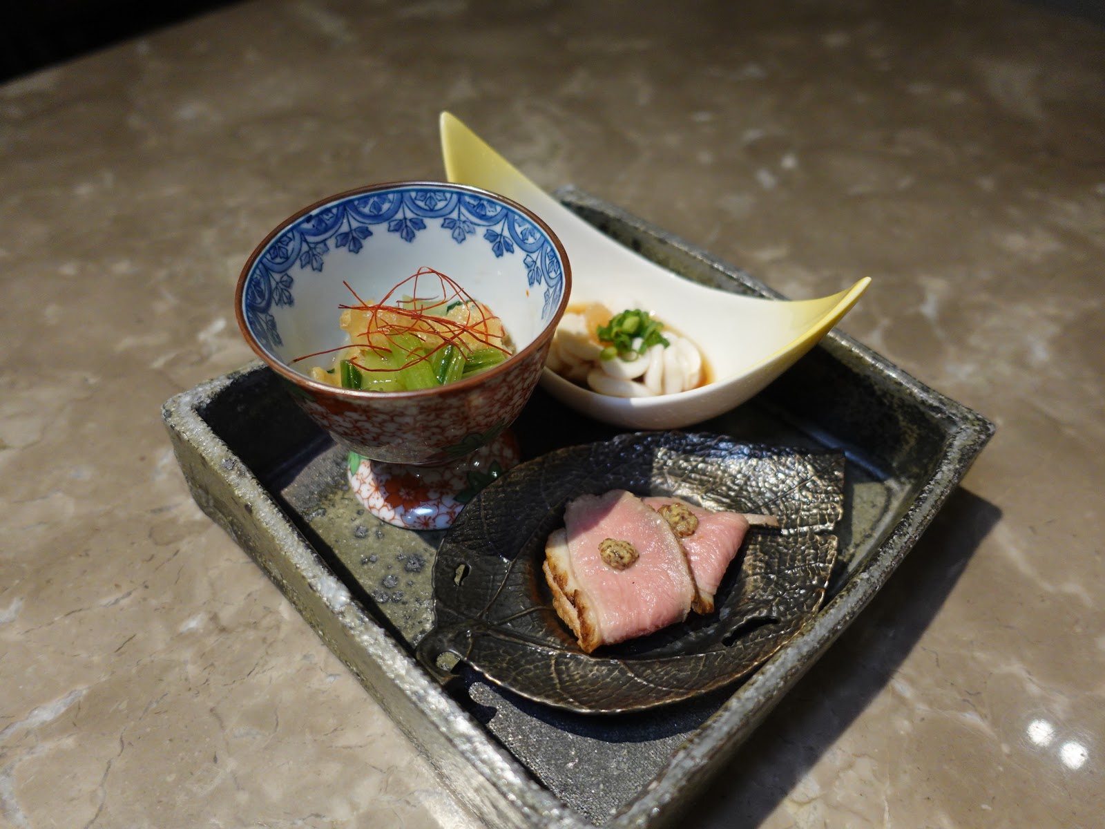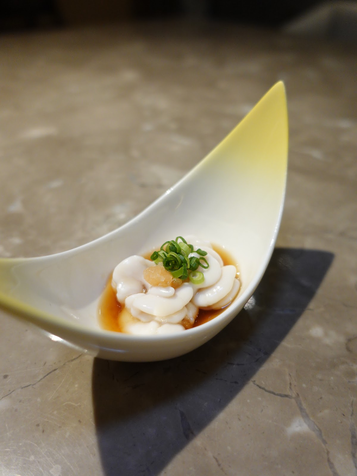 光從擺盤見已見店方的心思,三款前菜包括鱈魚白子伴柚子醋、煮薄切鴨胸和清煮小松菜及日本炸豆腐。三款皆是水準以上,最令人心動的是鱈魚白子伴柚子醋,白子肥美漱滑帶甜,沒有腥味,柚子醋更能提升香氣~