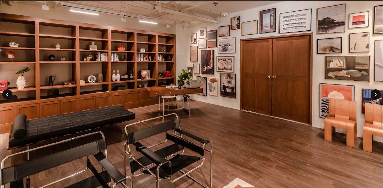 「NYC Loft」則以混合美式復古風格及紐約現代Loft元素組成,粗獷感的Loft 空間注入復古傢俱作點綴,以佈滿藝術畫作的主牆為區隔,整面的書櫃、棕皮沙發、木質辦公桌搭配現代感壁爐,交織出兼具古典優雅與文藝氣息的書房場景。這裡無疑是追求獨特藝術的創作者的不二選擇。整個空間注入了藝術氣息與經典韻味,巧妙營造出典雅大方及知性雅致的氛圍,沉浸其中必然從別具風格的場景得到繆思的眷顧。