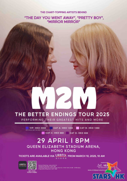 Midas Promotions驚喜地宣佈挪威流行音樂組合 M2M將首次來到香港作現場表演,帶來大家萬眾期待的 “The Better Endings Tour 2025″。M2M The Better Endings Tour 2025 將於 2025 年 4 月 29 日 (星期二) 晚上8時在伊利沙伯體育館表演場舉行。票價分別為港幣2,088元(VIP)、港幣1,288元、港幣1,088元、港幣888元及港幣688元,於2025年3月10日 (星期一) 上午10時起通過城市售票網作公開發售。