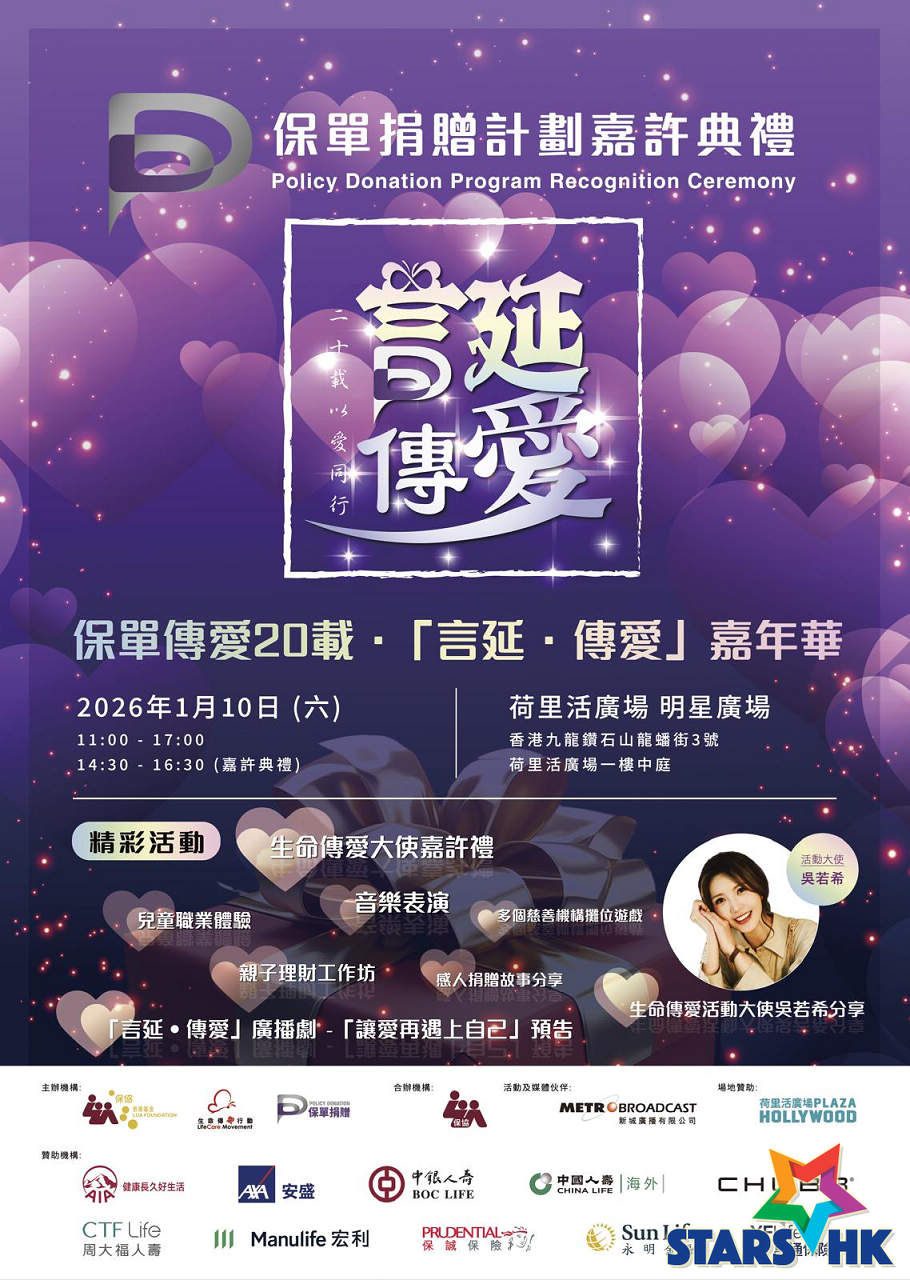 保協慈善基金~生命傳愛行動主辦《保單捐贈計劃嘉許典禮 暨「言延 · 傳愛」嘉年華》將於本週六(1月10日)上午11時至下午5時在鑽石山荷里活廣場舉行,而下午2時30分舉行盛大嘉許典禮,邀得勞工及福利局副局長何啟明先生, JP、保協會長陳頌琳小姐、保協慈善基金主席陳鳳玲小姐、生命傳愛行動主席馬驊伯先生,以及人氣歌手吳若希「生命傳愛大使」擔任主禮嘉賓;而「抗癌戰士」任永健分享及表演,齊齊見證愛心隨保單延續。