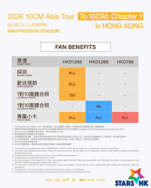 如果你想在現場細聽10CM的精彩演出,以及迎接他特別準備的觀看綵排、歡送、合照、專屬小卡等多種福利,就不要錯過《2026 10CM Asia Tour