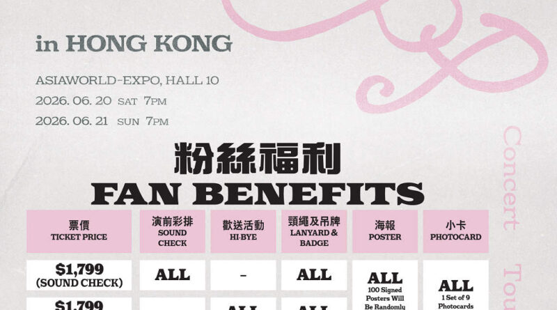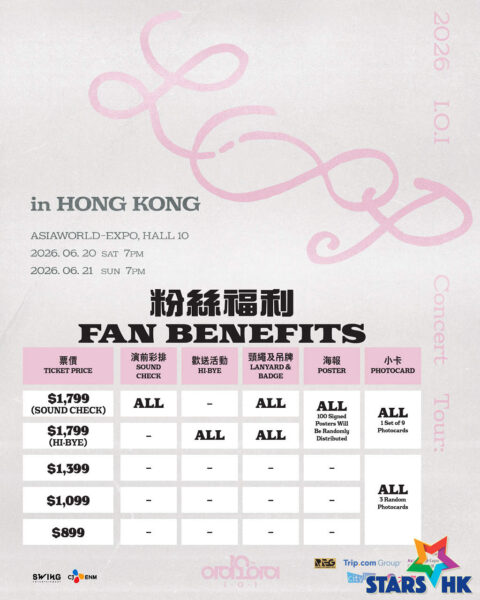 *所有購買$1,799門票的觀眾將可參與演前彩排或歡送活動,並獲得海報一張(其中將隨機派發100張簽名海報)、香港場專屬小卡一套、專屬頸繩及通行證。